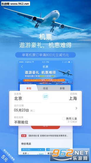 【机票立减】单笔机票订单满800元立减15元,再送5元App机票体验券!