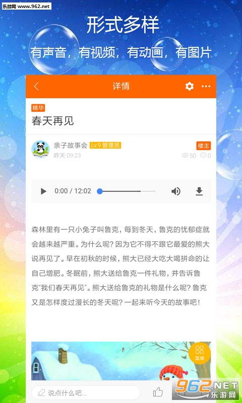 亲子故事会,不止有故事,还有知识,还有游戏,还有育儿指导,还有家长的互动与探讨。在这里,我们可以一起听故事,一起学英语,一起做手工,一起做美食,一起学音乐,一起谈育儿。。。