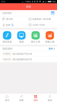 3. 方便快捷。项目信息,考勤信息,一目了然。签到请假,销量上报一键即达。