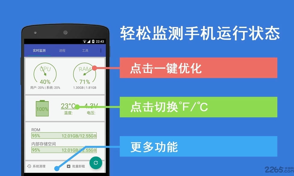 android助手apk,是一款安全优化应用,能够智能检测手机的网络环境,能够清除卸载残留,优化开机时间,自动省电,能够对文件进行管理,还有检测系统的功能,喜欢的朋友就来2265安卓网下载体验吧!