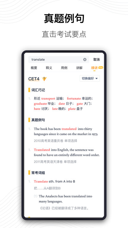 2、支持简明词义,词性变化,同反义词,参考例句,语音读词等功能,对查询词汇给予尽可能全面的解释。