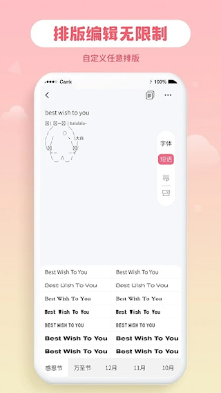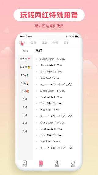 1、字体界面提供了丰富的字体和装饰资源可一键复制,可一键复制收藏方便后续使用和快速调用应用。