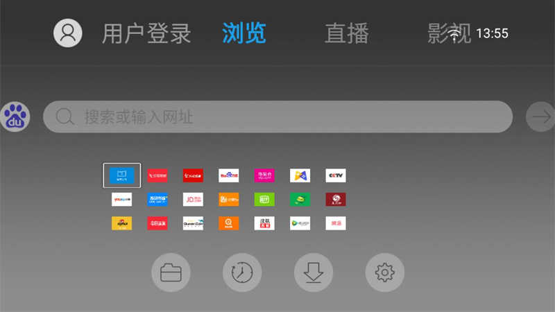 安装完成后,打开飞视浏览器即可进入主界面。主屏下方整齐排列各类网站图标,点击即可快速跳转至对应平台。进入目标网站后,便可自由浏览内容、观看视频,享受专为大屏优化的沉浸式体验。