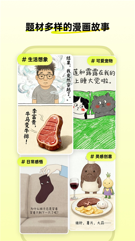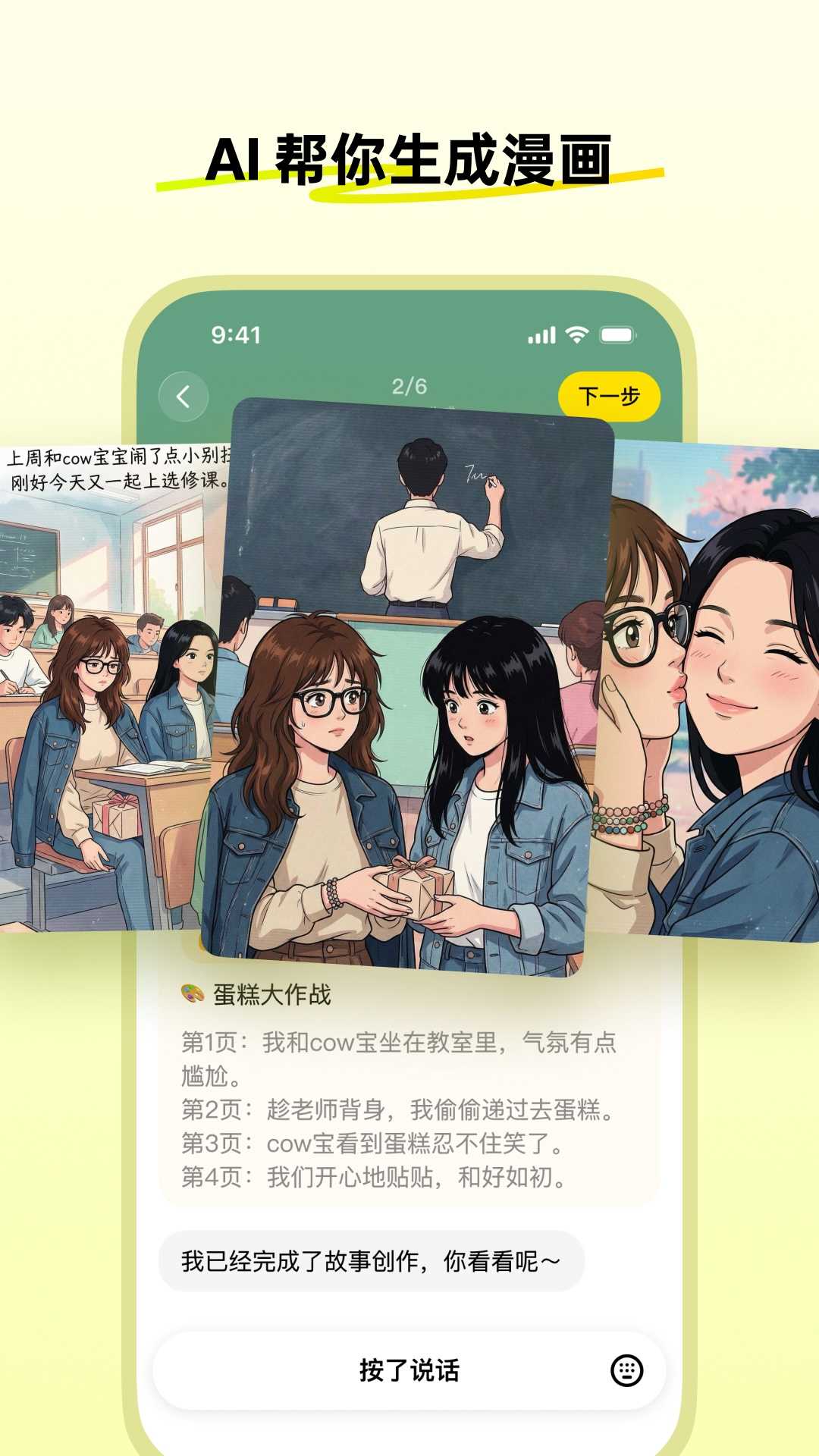 生活里的每个瞬间、事情和想象,你只需一张照片和一段描述,就能创作出一段精彩的漫画。