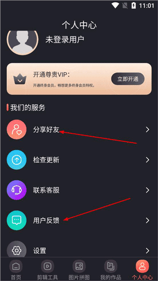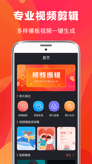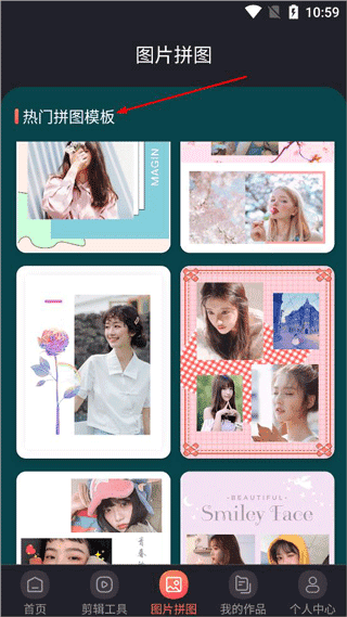 应用界面清晰划分为五大核心板块:首页汇聚热门模板与快捷工具;剪辑工具页提供专业级编辑功能;图片拼图支持多种潮流布局;我的作品集中管理所有创作成果;个人中心则便于分享视频或反馈建议。整个流程流畅连贯,创作从未如此简单。