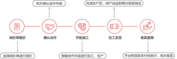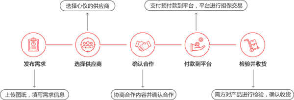 ①发布订单-->②在线比价-->③定标付款(需方预付货款至平台)-->④验收支付(确认验收合格,平台支付货款至供方)