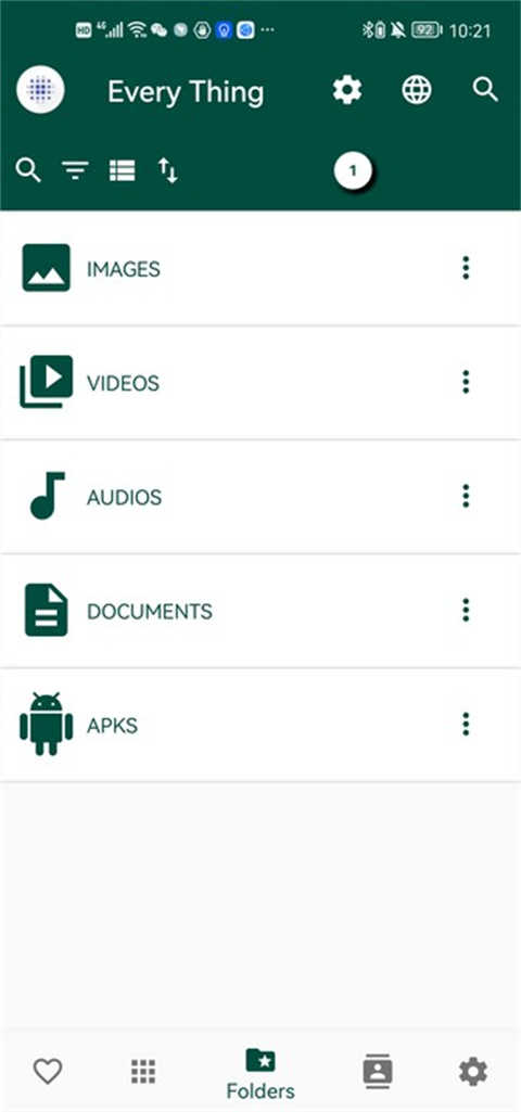 得益于极简UI设计,EveryThing操作逻辑清晰,新手也能快速上手。主界面划分为收藏夹”应用程序”文件夹”通讯录”设置”五大板块,配合列表与网格双视图、媒体缩略图预览等功能,让内容浏览更流畅、更直观。
