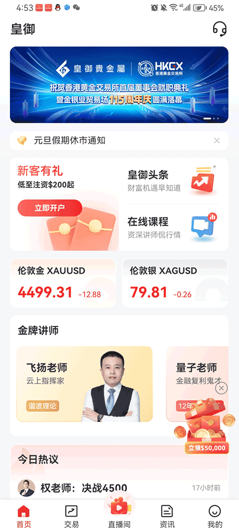 平台直连国际市场,提供黄金、白银等贵金属的毫秒级实时报价,并整合全球财经热点、皇御金评专业解读、财经日历等关键信息,助你精准捕捉市场脉搏,做出更明智的投资决策。