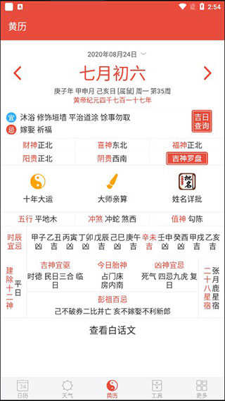 3、进入黄历界面,可详细查看当日的宜忌事项、冲煞、吉时等传统信息,助您合理安排活动。