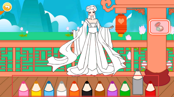 3. 点击底部【彩色铅笔】图标,选择颜色,开始为公主与她的世界填满缤纷色彩。