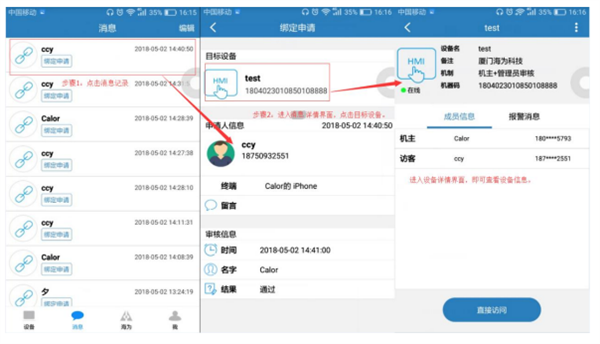 查看设备详情:登录APP后进入【消息】界面,点击任意消息记录,再点击【目标设备】,即可查看该设备的详细信息与运行状态。