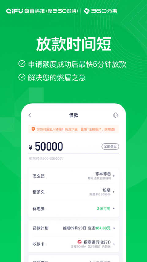 4、放款效率:360分期app最快仅需一天即可放款