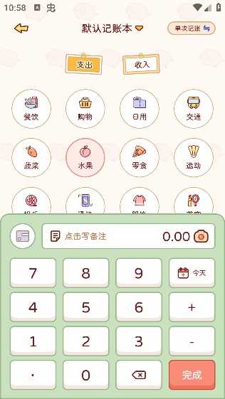 点击底部中央的+”号,即可快速添加一笔收支记录。系统提供丰富的分类选项,只需选择类目并输入金额,几秒内完成记账。