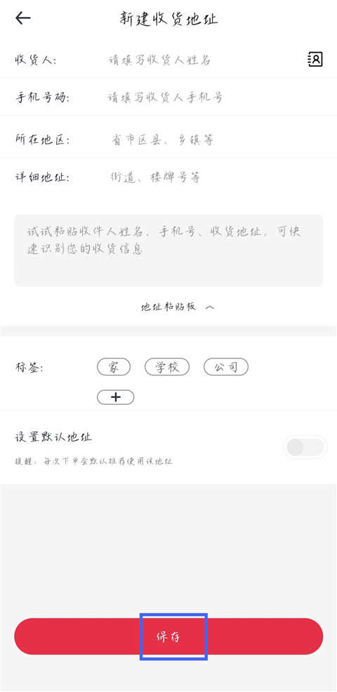 4、输入收货人姓名、手机号码及详细地址,确认无误后点击【保存】即可完成设置。