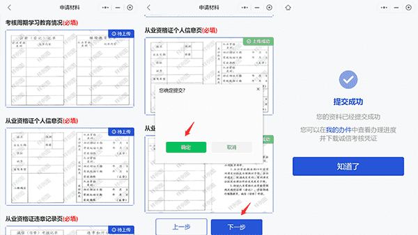3、从业资格证违章记录页。申请人根据页面展示的上传材料示例,上传格式为png、jpg,大小不超过10M的图片并确保上传的电子影像清晰可见。上传成功的材料,右上角会显示上传成功”字样。上传完成并确认无误后点击【下一步】进行提交。