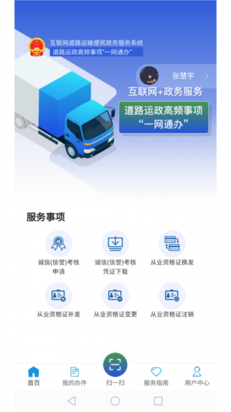 一、登录运政一网通办app 后,通过【服务事项】-【诚信(信誉)考核申请】,进入道路运输驾驶员诚信(信誉)考核业务流程。