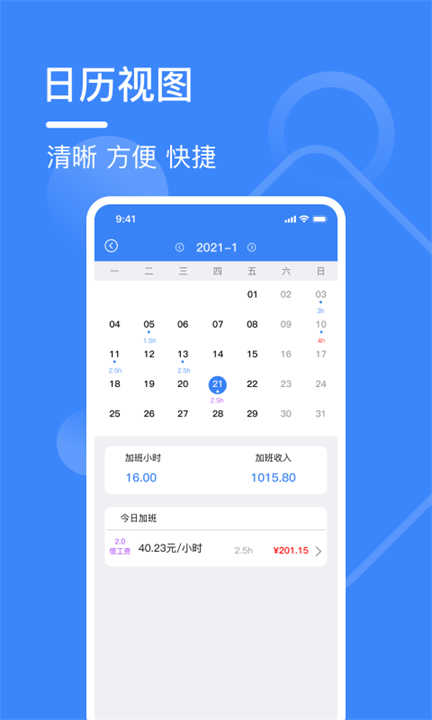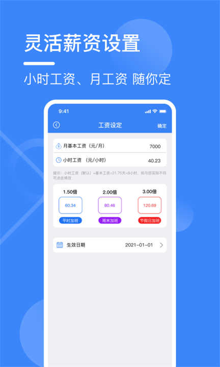 【加班记录与自动计算】 只需输入加班起止时间,系统即可自动计算加班时长并按预设规则生成对应工资,精准无误,省去手动核算烦恼。