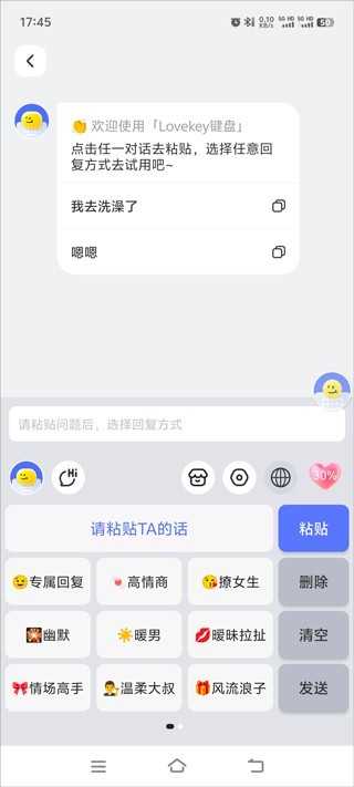 大量用户反馈,Lovekey 键盘旧版本界面简洁直观,功能布局合理,上手毫无门槛。其智能识别能力出色,能根据上下文精准推荐回复建议,显著提升聊天效率。尤其在情感交流场景中,亲密度调节功能帮助用户自然把握分寸,避免过度热情或过于冷淡。同时,高度可定制的外观设计也让每位用户都能拥有独一无二的输入体验,广受好评。