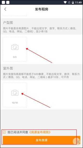 最后,点击相机图标上传室内实景图、户型图及实勘资料,确认无误后勾选发布规则,点击发布房源”即可完成操作,让优质房源迅速触达潜在客户。