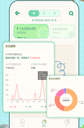 支出趋势:通过直观的图表展示每日、每周、每月的收支变化,帮助你清晰掌握资金流向,科学调整消费结构。