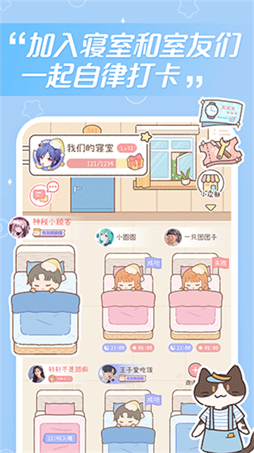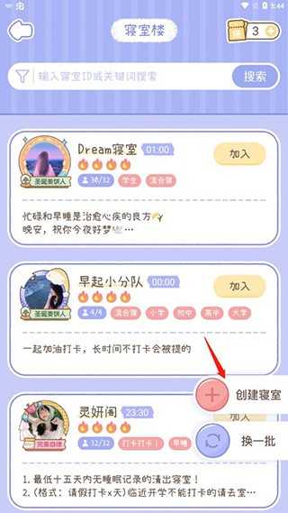 在梦境旅店中,用户可以创建属于自己的寝室”,邀请好友一同培养健康作息。操作简单直观:首先进入寝室版块,点击创建寝室”按钮。