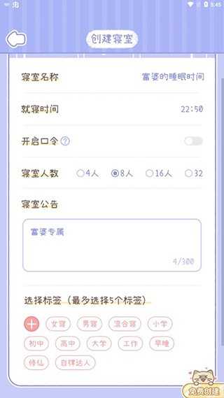 随后填写寝室名称、设定就寝时间、设置口令、限定人数,并添加公告内容,还可自由选择标签,打造个性化空间。