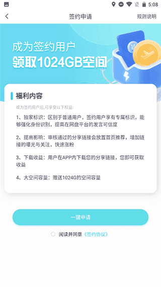 2、点击一键申请”提交申请,审核通过后即可正式成为签约用户。