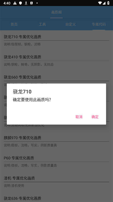 针对不同芯片平台(如骁龙、天玑、麒麟等),画质阁Pro提供专属优化代码。以骁龙710为例:进入软件后选择对应型号,系统将自动加载最佳参数组合,无需手动调试,真正实现一键优化”。