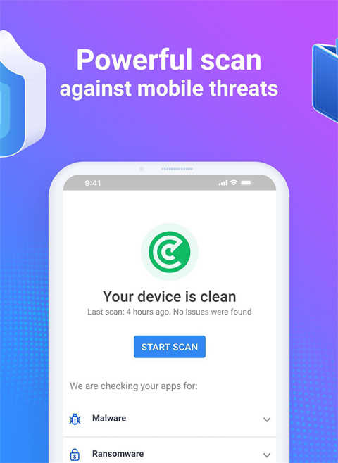 凭借经过独立验证的 100% 检测率,Malware Scanner 会自动扫描所有移动应用程序中的病毒、恶意软件和任何其他威胁,以保护您的 Android 设备。