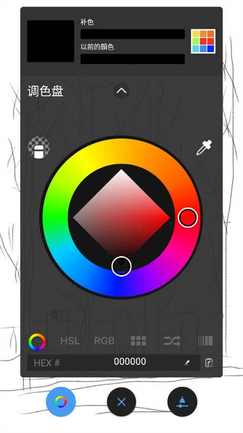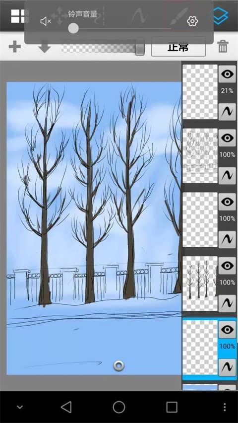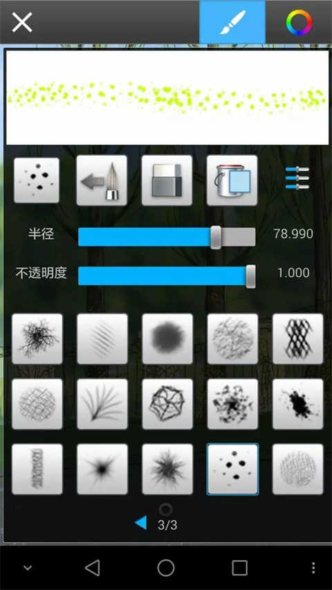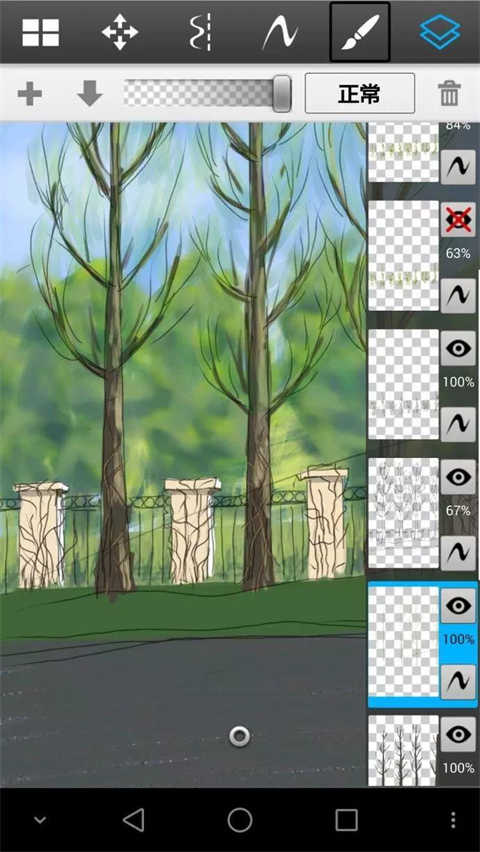 尽量多的按照类别分图层,但是这个软件手机版只有16个图层,把刚才的远树从新用喷笔画模糊了些,近树树叶透明然后下面介绍另外一种笔加细节