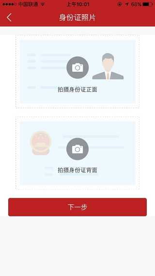 5、点击下一步”按钮进入身份证拍摄页面,拍摄客户本人身份证正面和背面图像;
