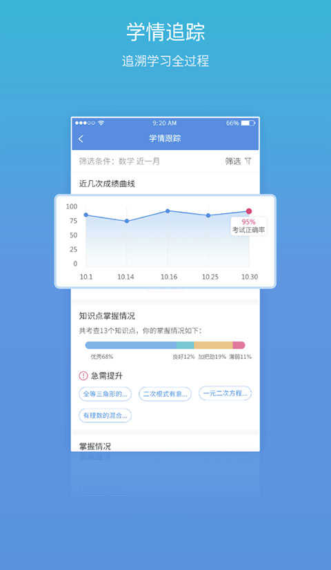 追踪历次考试信息,精细分析学生知识掌握的优势、缺陷和认知能力水平。
