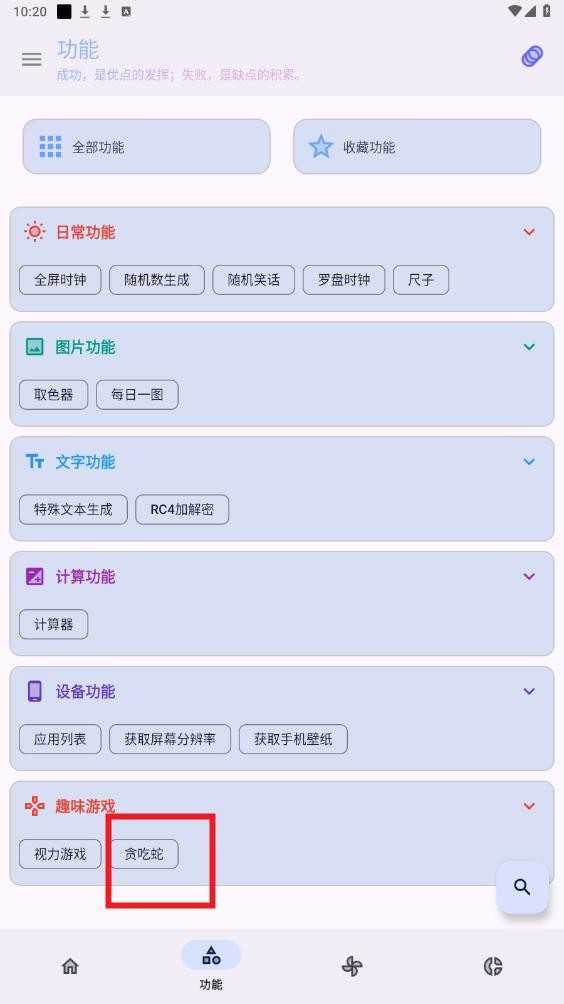 向左滑动至第二屏,可浏览更详细的功能分类,轻松找到贪吃蛇”视力测试”等趣味或进阶工具,探索更多实用惊喜。
