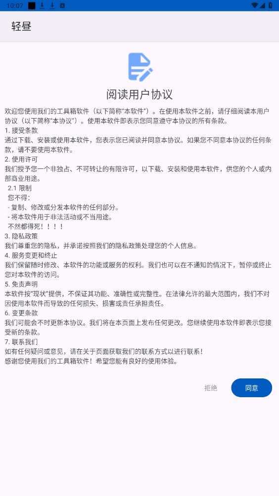 打开轻昼后,点击【开始】按钮即可进入应用。首次使用需同意相关协议,随后便直达简洁直观的主界面。