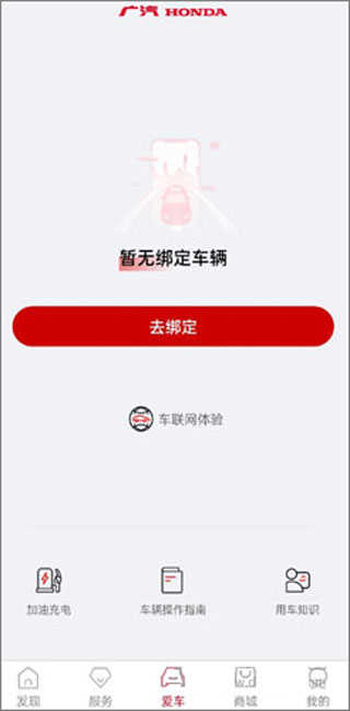 1、进入【爱车】页面,点击【去绑定】按钮(首次操作需授权登录)。