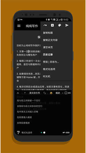除了独有的段间距,纯纯写作一开始还提供了「启动立马进入编辑页面」以及特有的「历史记录」功能。特别是历史记录功能,实际上作为一个写作者,我深知历史记录功能实在太重要了,它能够让你拥有难得的安心、放心写作的感觉,而且纯纯写作做到了即使手机瞬间断电关机,也能够实时自动保存,绝不丢失内容。这样的好处是,大家可以随时暂停和随时继续写作,并且配合纯纯写作的软键盘状态记录与恢复,来回切换将令人感到特别流畅舒适。