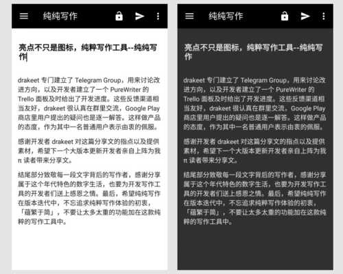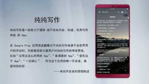 蕴繁于简。许多编辑器该有的功能,纯纯写作也都没有落下,比如 WebDAV 云备份、段首缩进、生成长图片、指纹加锁、Markdown、更换信纸、夜间模式、单词联想输入、打字机模式、撤销、字数统计 等等。但即使这样,纯纯写作仍然保持了简约的设计风格,遵循 Material Design 设计,并且它还有一个像是哆啦 A 梦 时光机 的图标,寓意着「文字能够连接过去,遥想未来」,也照应了纯纯写作特别提供的「历史记录」功能。