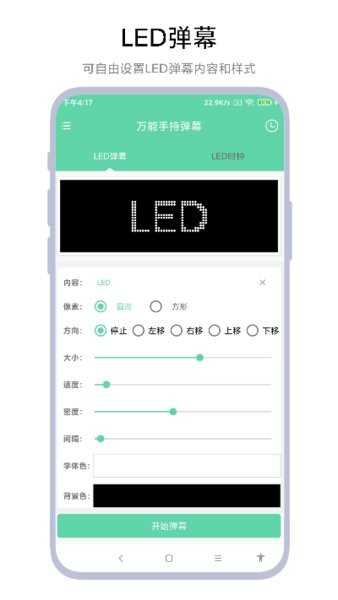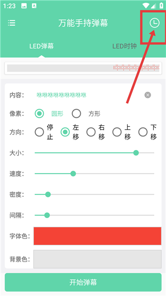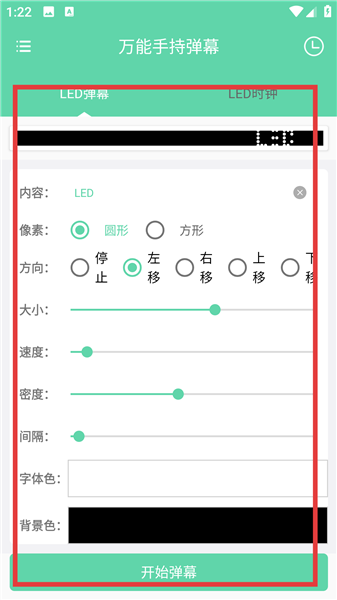1、打开万能手持弹幕进入LED弹幕设置界面,在内容输入框中填写需要显示的弹幕文字,依次设置像素形状、大小、速度及背景色等参数,完成弹幕效果配置。