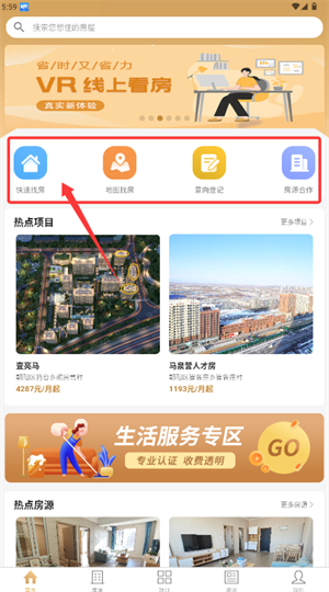2、登陆成功后返回主界面,选择快速找房功能浏览各类房源列表信息。