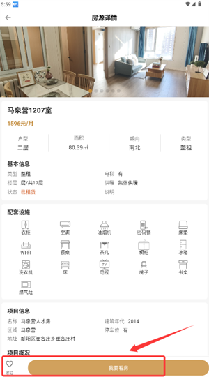 3、选定意向房源后进入详情页面,点击预约看房按钮即可提交申请。