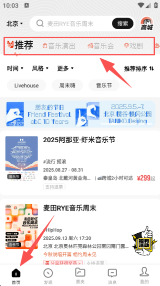 1、进入APP首页后,根据上方推荐、音乐演出、音乐会等栏目找寻你想观看的演出进行购票。