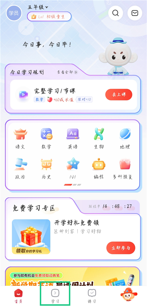 1、进入希望学app中,选择【学习】页面。