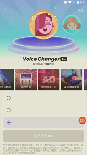 VoiceChanger VIP破解版是一款功能强大、完全解锁的变声神器,无需付费即可畅享全部VIP特权。无论是想秒变萝莉、御姐、大叔、机器人,还是模仿影视角色、方言口音甚至明星声音,这款应用都能一键实现。它不仅支持实时录音变声,还能导入音频文件进行后期处理,并提供海量音效与环境背景音,让你的声音创意无限延伸。无论用于聊天整蛊、视频配音,还是制作趣味铃声,VoiceChanger 都是你玩转声音的最佳拍档。