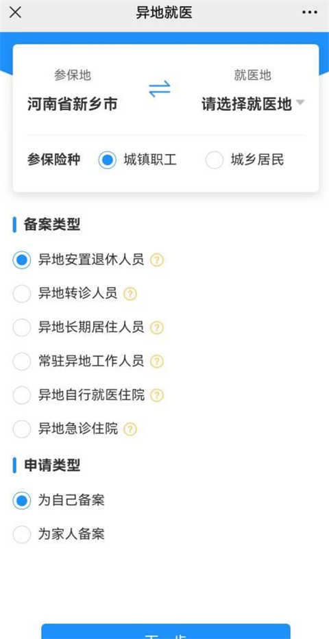 2、选择就医地,并且按照实际需要选择参保险种、备案类型及申请类型选项;按照页面填写对应的信息,下载并填写对应的备案表,上传备案材料;
