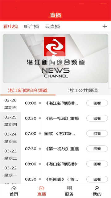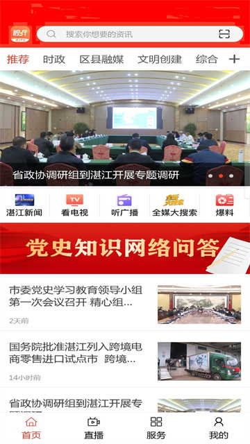 视听湛江app是一款本地视频资讯类手机软件,分为直播、点播、新闻(资讯)、生活(服务)4大板块。市民通过手机小屏幕即可随时随地看电视,实时观看及回看湛江新闻综合频道”、湛江公共频道”的全天候电视节目,其中包括《湛江新闻联播》、《第一视线》及《全媒大搜索》三大新闻资讯节目;此外,市民还能通过视听湛江”APP收听湛江新闻综合广播FM98.1”、湛江经济广播FM95.1”、湛江交通音乐广播FM102.1”三大广播频率,这些广播频率覆盖了湛江所辖地区乃至全国各地,通过APP可实现广播随时听。