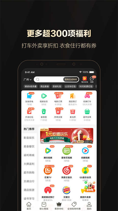 目前,骑士会员可享受爱奇艺视频5折、腾讯视频5折起、优酷视频5折、芒果TV5折、搜狐视频6折、QQ音乐9.2折、网易云音乐8.8折起、酷狗音乐会员9.3折,还有更多充值优惠待你加入来探索,比如话费充值、文档编辑类会员等等。