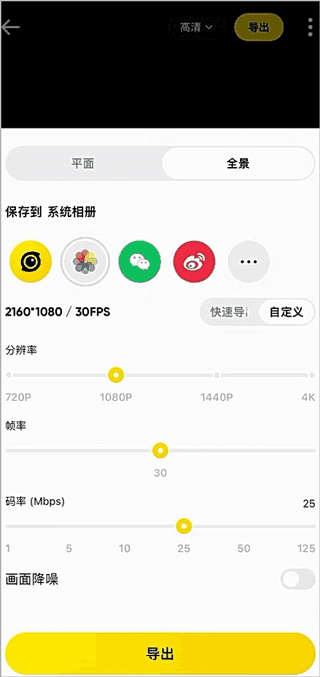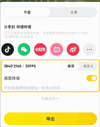 若想直接在抖音、B站等支持全景视频的平台上传全景视频,或通过手机上的全景视频播放软件观看,可在导出设置界面切换至「全景」选项,并设置全景视频导出参数