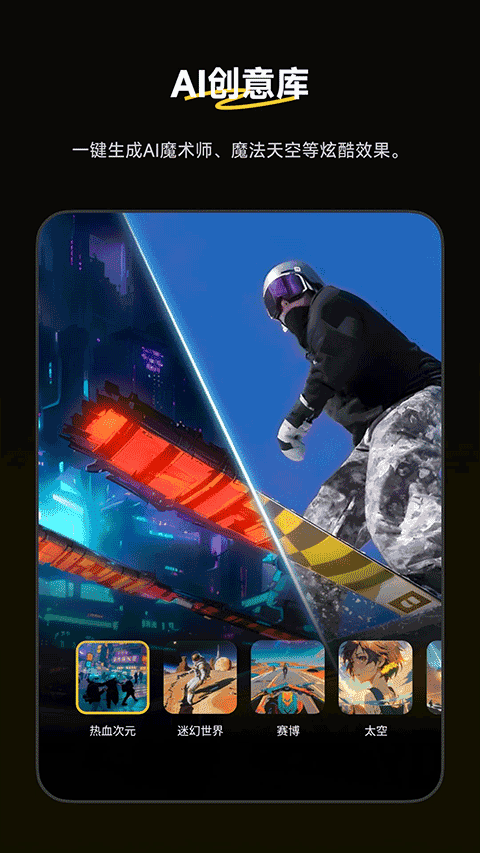 【AI 创意库】收录魔法天空” AI 魔术师”等爆款特效,支持多片段音乐、转场编辑,并一键分享至朋友圈、B 站、、小红书等主流平台。