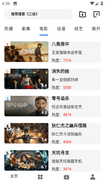 1、资源聚合搜索,一个应用观看全网热门影视。