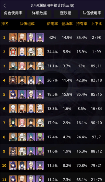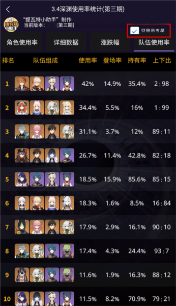 进入APP后,点击更多功能”模块,选择队伍使用率排行”。页面将清晰展示当前版本各队伍的使用频率、角色搭配详情及数据变化趋势。你还可以勾选只看五星角色”选项,快速筛选出高稀有度角色的配队情况,为自己的阵容优化提供参考。